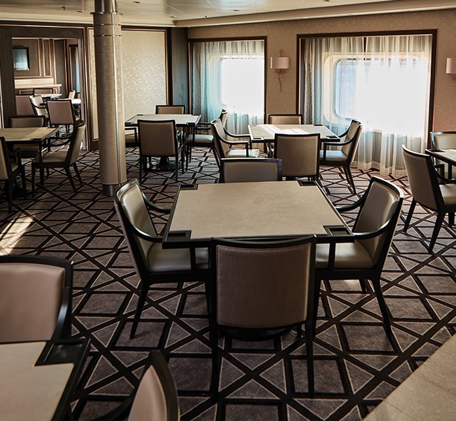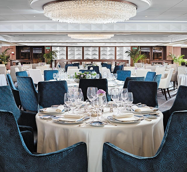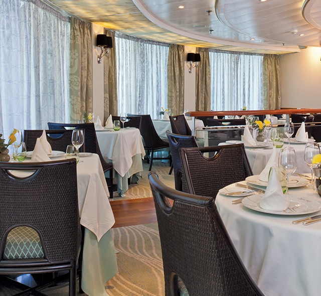 ![]() | Compass RoseAs the flagship restaurant aboard each of Regent’s ships, the wonderfully spacious Compass Rose serves breakfast, lunch and dinner and features an exceptional variety of European-inspired Continental cuisine, as well as flavorful vegetarian and kosher dishes. Elegantly decorated in blues and silvers with stunning Versace tableware, Compass Rose delights with a beautifully refined atmosphere bathed in natural light during the day. |