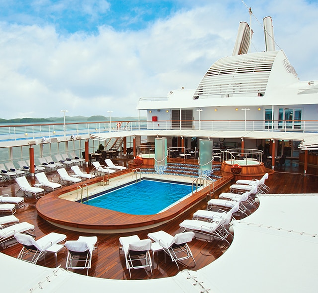 ![]() | Pool DeckRegent’s Pool Deck features a large heated pool, two whirlpools and table tennis. Surrounded by luxurious teak accents, you’ll be consistently awestruck by the pool’s magnificent vistas high upon Seven Seas Navigator®. You’ll also be impressed by their amiable and dedicated crew, who stand at the ready to provide refreshing beverages and lounge chairs. |