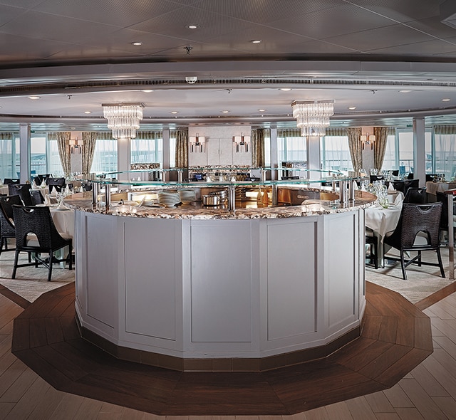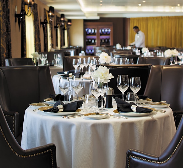 ![]() | Prime 7A true classic in every sense, the newly refurbished Prime 7 on Seven Seas Navigator® is the epitome of luxury dining. Dark imperial blue walls accented with gold, light leather chairs and rich wood finishes provide a refined and elegant backdrop for prime steaks and seafood. Large artwork, marble sculptures and intricately patterned floors enhance the décor. Enjoy a cocktail at the bar before savoring a succulent filet mignon or côte de boeuf. |