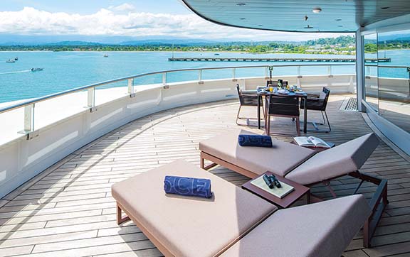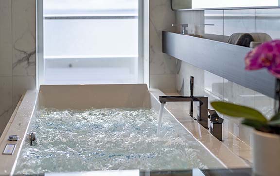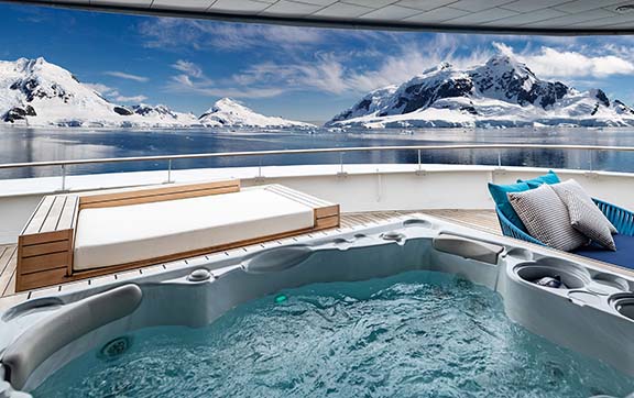 Imagine returning from an exhilarating day on shore to your private spa suite, with a steaming Jacuzzi drawn by your butler. Gaze out over your verandah to the vistas beyond and sip on a glass of champagne – heaven.