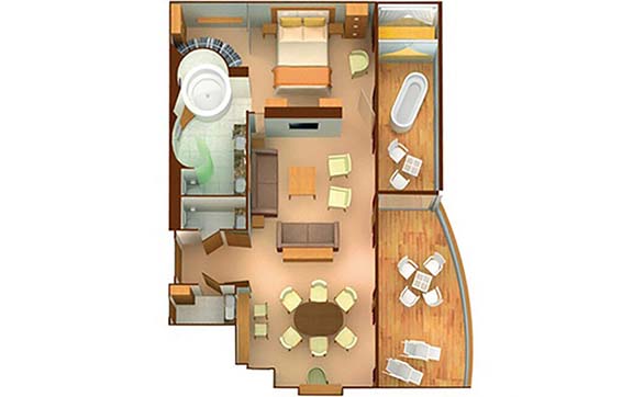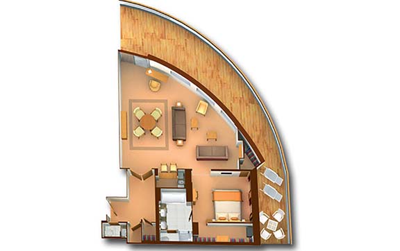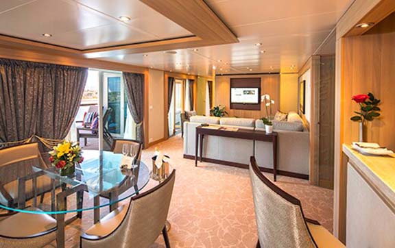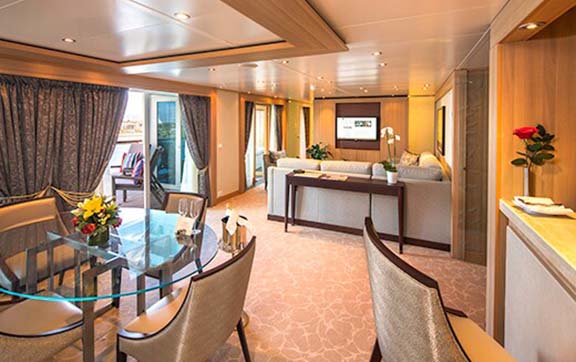 Signature Suites feature expansive ocean views, forward-facing windows, dining for four to six, bathroom with whirlpool bathtub, guest bath, pantry with wet bar, and two flat-screen TVs. Complimentary Internet/Wi-Fi service.