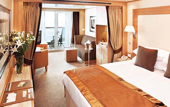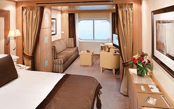 All Ocean View Suites feature a large picture window, comfortable living area, queen-size bed or two twin beds, dining table for two, walk-in closet, interactive flat-screen television with music and movies, fully stocked bar and refrigerator, makeup vanity, spacious bathroom with separate tub and shower.