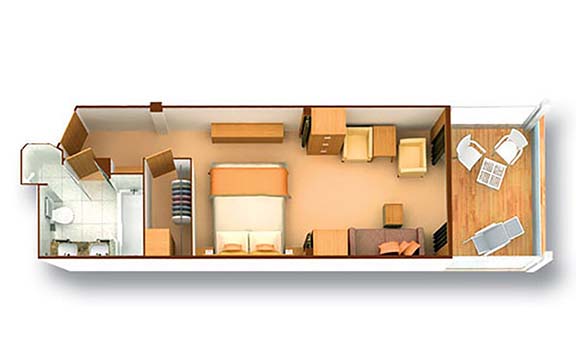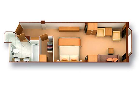 Located on Deck 7; Approximately 300 square feet (28 square meters) of inside space, plus one veranda of 65 square feet (6 square meters)