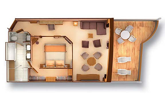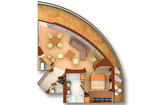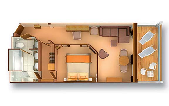 Located on Deck 5; Approximately 300 square feet (28 square meters) of inside space, plus one veranda of 65 square feet (6 square meters)