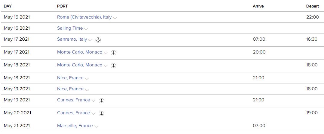 Rome (Civitavecchia), Sanremo, Monte Carlo, Nice, Cannes, Marseille
