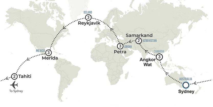 Sydney – Angkor Wat – Samarkand – Petra & Dead Sea – Iceland – Merida & Chichen Itza – Tahiti – Sydney