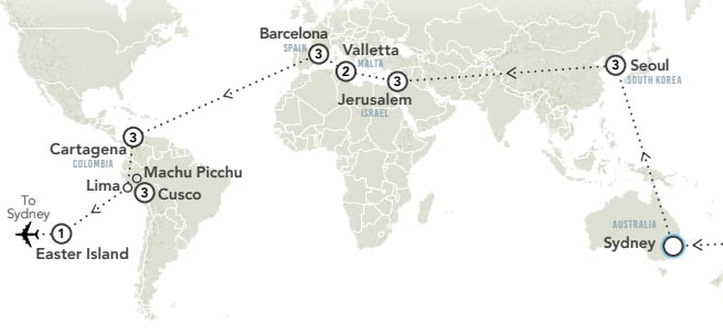Sydney – Seoul – Jerusalem – Valetta – Barcelona – Cartagena – Machu Picchu – Easter Island – Sydney