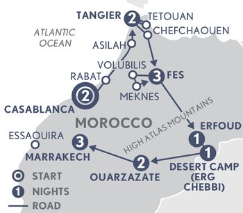 You’ll see all the colours of exotic Morocco on this extraordinary journey: the deep blue of the Atlantic Ocean, the dazzling white buildings of Tangier, rainbow hued spice stalls, golden desert sands, green palm groves and the earthy terracotta of the kasbahs. Against this vibrant backdrop are the patterns of mosaic tiles, handmade pottery, stitched leather and handwoven rugs – the essence of Morocco’s craft heritage and everywhere impressive monuments, gardens and a rich, flavoursome cuisine.