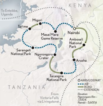 Fly back to Nairobi and spend the afternoon at leisure in a comfortable dayroom. In the evening, transfer to the airport for your departure flight or begin a Post-Tour Extension to Uganda.
