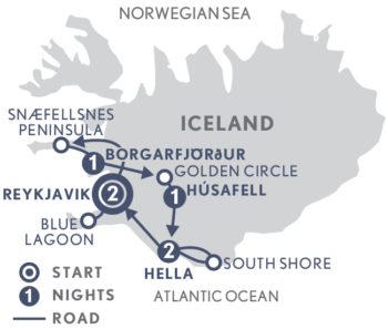 Compact and stylish, Reykjavik is easy to navigate. A private city walking tour includes the 19th century Parliament House, Reykjavik Cathedral, the impressive steel and glass-framed Harpa concert hall, and the whimsical Hallgrímskirkja church which towers over the city. The afternoon is at leisure to further explore, shop, visit a local coffee house or relax at the hotel.