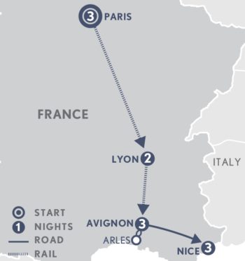 From the grand museums and monuments of Paris where you’ll discover the cultural secrets of the ‘City of Light’, travel south to the Rhône where the delights of Lyon await and follow the river into sunny Provence and the glittering Côte d’Azur.
