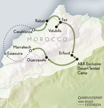 Begin the day in the port city of Casablanca, Morocco’s largest metropolis and its commercial hub. Visit the stunning Hassan II Mosque, which accommodates up to 25,000 worshipers; its minaret stands as the tallest religious structure in the world. Then, travel to the Moorish city of Rabat, capital of Morocco, to visit the Mohammed V Mausoleum, dedicated to the founder of modern Morocco, grandfather of the current king. View the Mauresque-style Hassan Tower and Oudaya Kasbah, along with its scenic Andalusian garden. Continue to Fez for a special cocktail reception followed by a welcome dinner hosted by A&K.